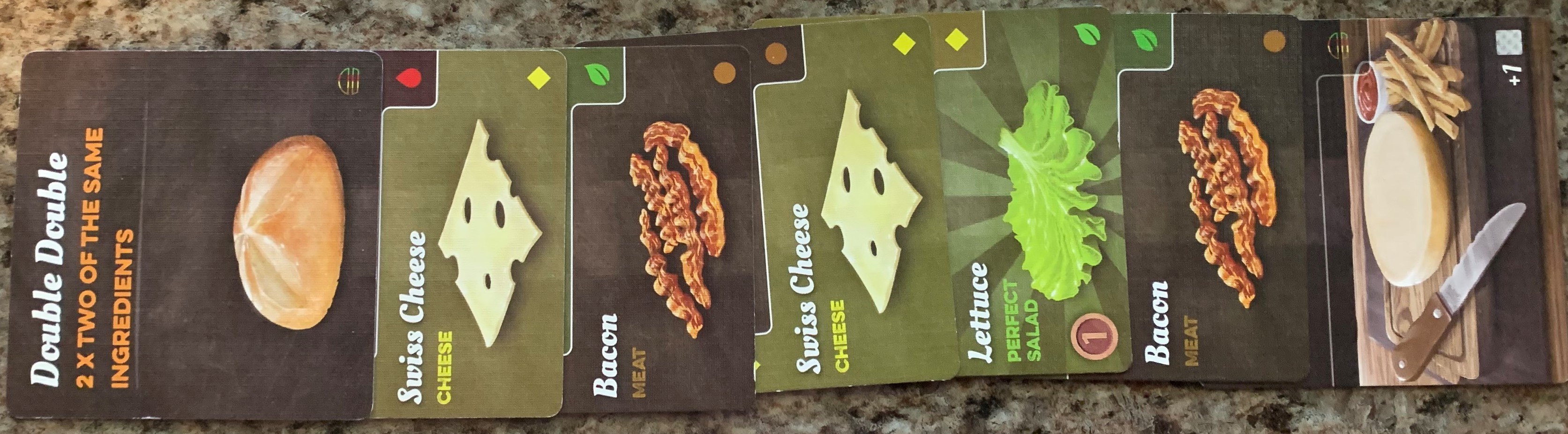 Each of the Ingredients cards can also be played in 1 of 2 ways. Each card lists two ingredients. The immediately preceding ingredient limits what can be played next. There are 5 types of ingredients, so the order of play limits your actions as you move from one ingredient to the next. This twist on turning the cards gives more ingredients to use but requires planning so you don’t leave yourself in a position of not being able to place the next ingredient on your stack.